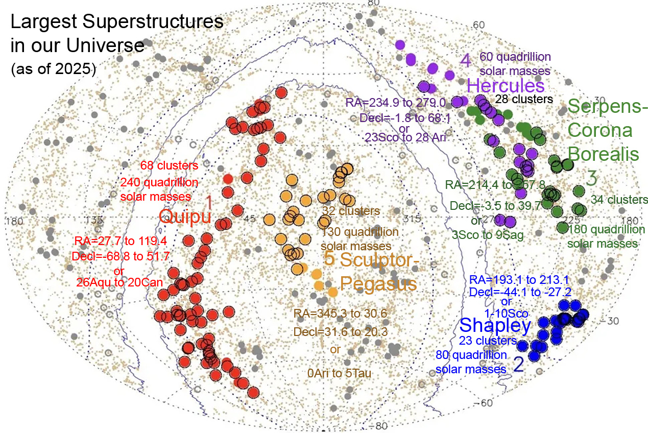 Astronomers are learning rapidly about the vastness of our universe and astrologers are catching up. Up untill 2025 Shapley was the largest superstructure containing numerous galactic clusters but four new and larger ones have been discovered. Unlike Shapley, these other four span two or more zodiac signs and until their centroid masses are determined there is little to go on astrologically. |